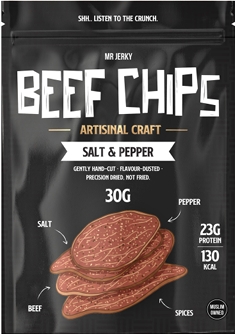 Elevate your snacking ritual with Salt & Pepper Beef Chips by MrJerky — a refined take on a timeless classic.