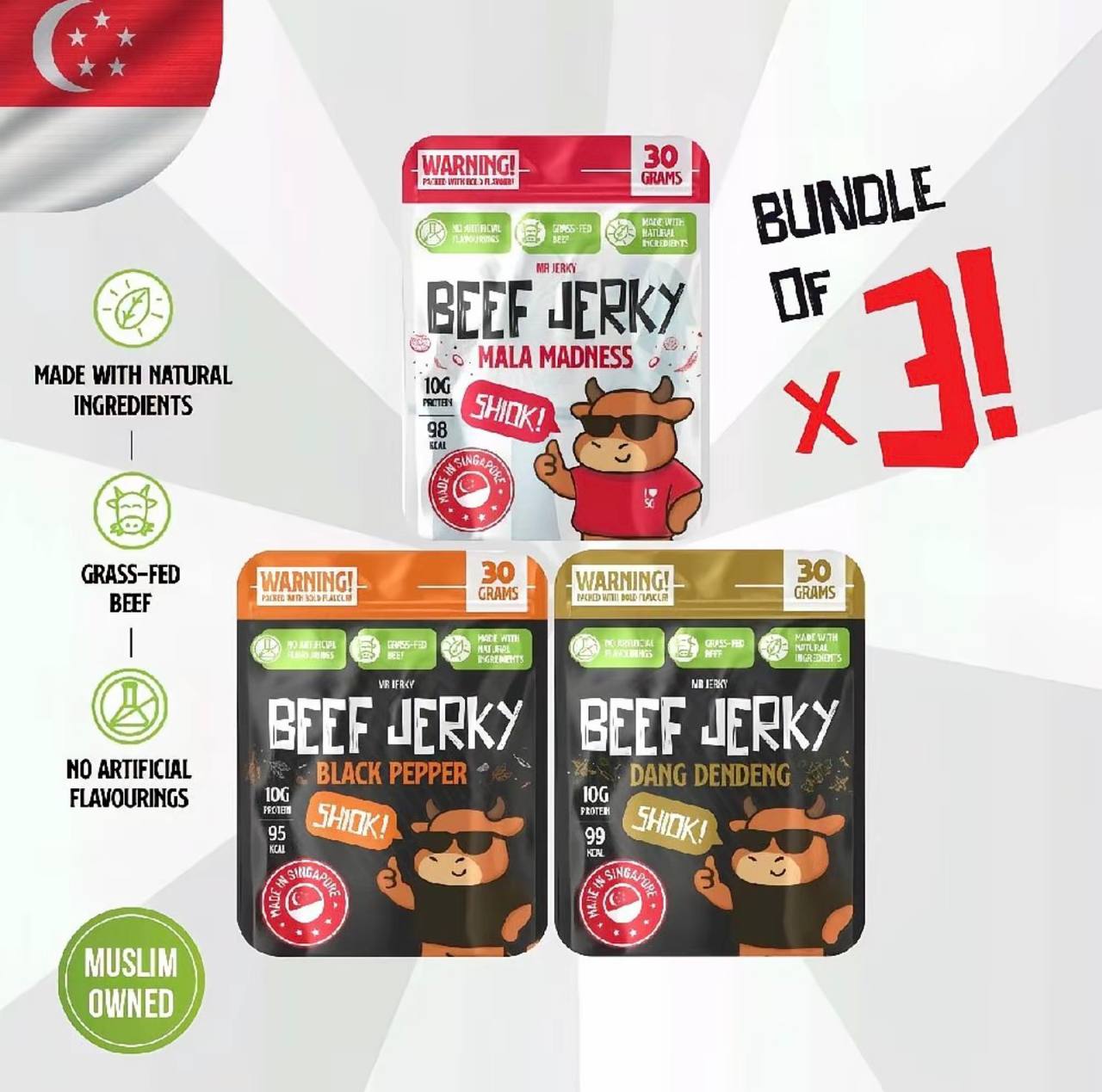 + Free ShippingTurn up the flavour with MrJerky’s Bundle of 3 — the ultimate trio for jerky lovers who crave bold, unforgettable taste. This curated set brings together three of our popular flavours, each crafted to deliver a unique punch in every bite.